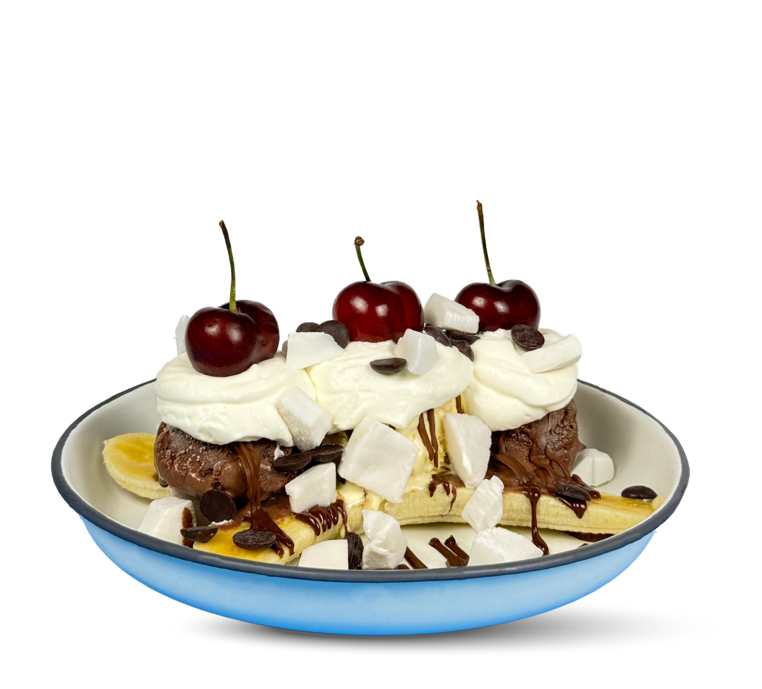 Banana split with “cocolate’” sauce and vanilla-flavored organic coconut chunks